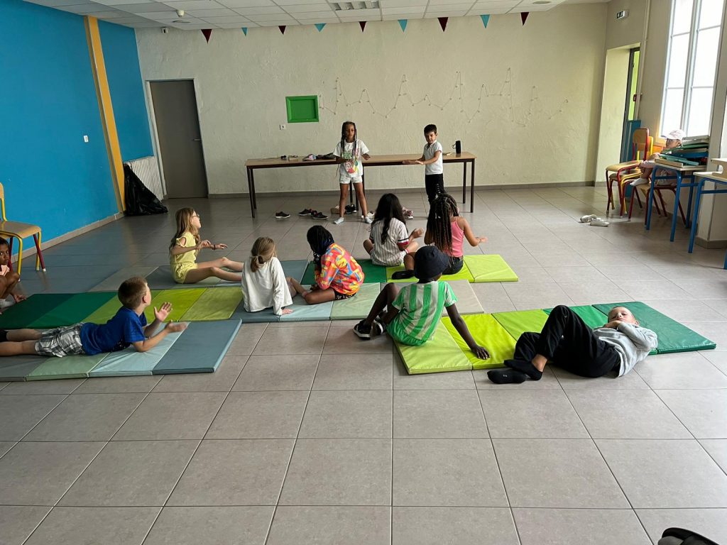 Ce matin, on a fait de la danse, Matthias nous a montré des chorégraphies et nous on faisait comme lui, ensuite on a fait des bracelets, et Lyséa a même construit une cabane avec les tapis.