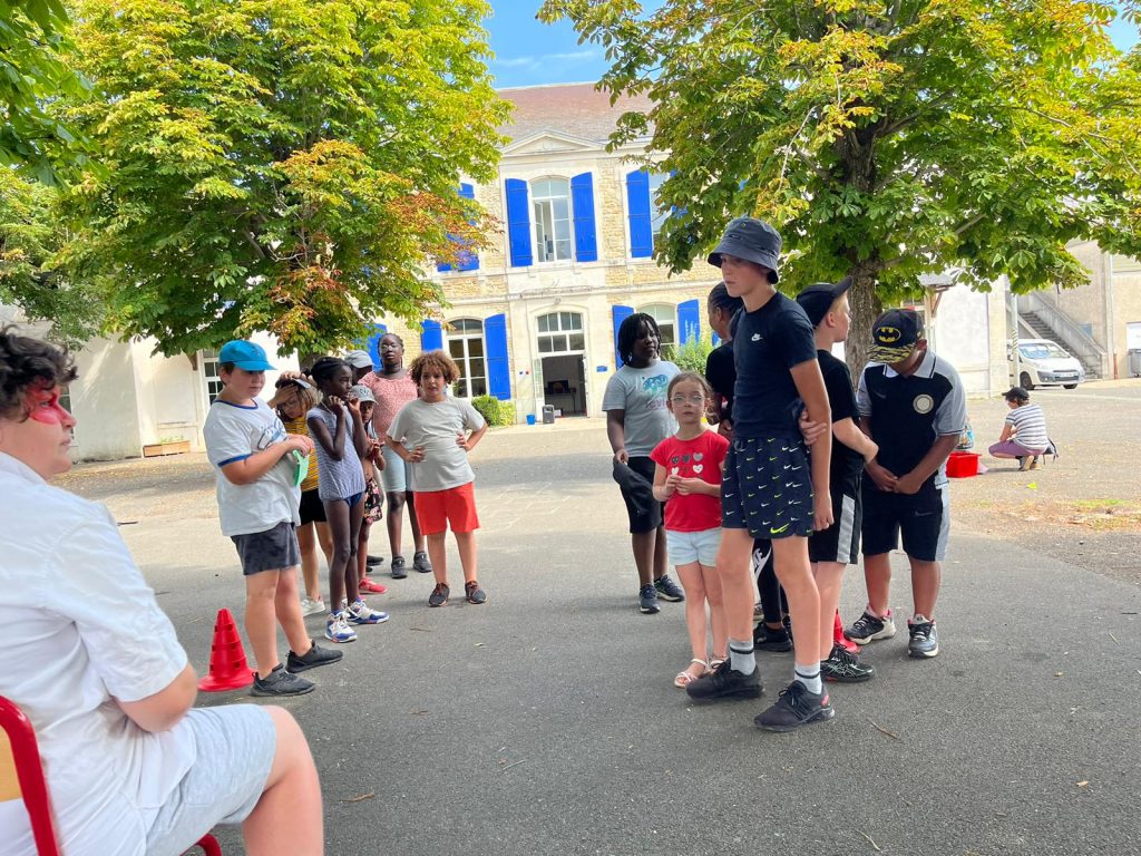 Ce matin, on a pris l’avion pour aller au Sénégal, une fois arrivé, on a fait différents petits jeux. On a fait un parcours avec des ballons les uns entre les autres, on a fait une bataille navale avec des ballons rempli d’eau et aussi un jeu où il fallait trouver les objets que nous demandait le fétiche. Ces épreuves nous permettaient de construire un mur afin de nous protéger d’une tempête de sable.