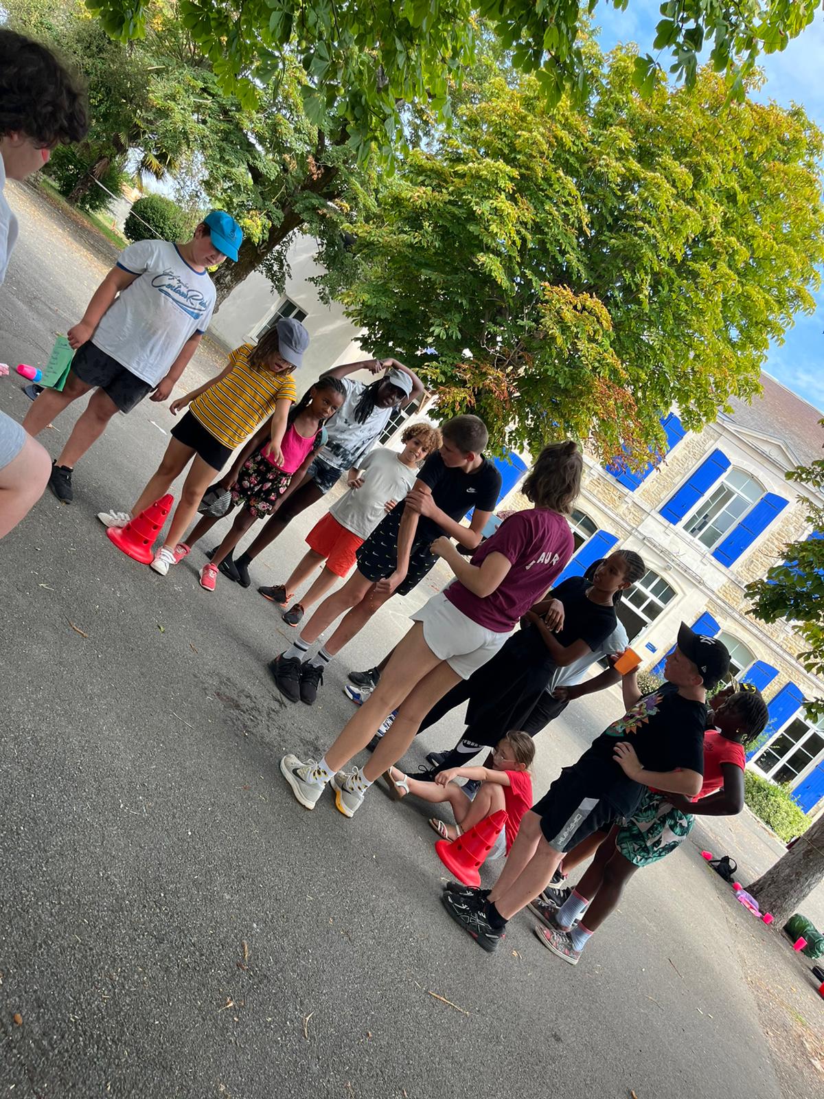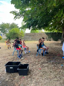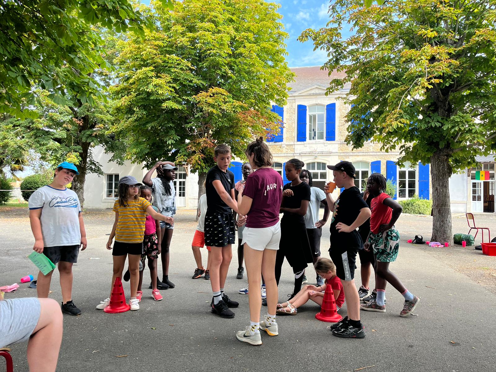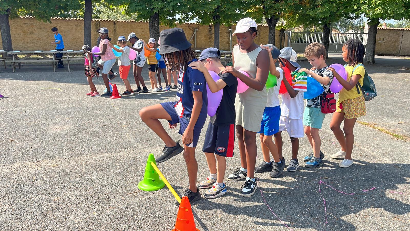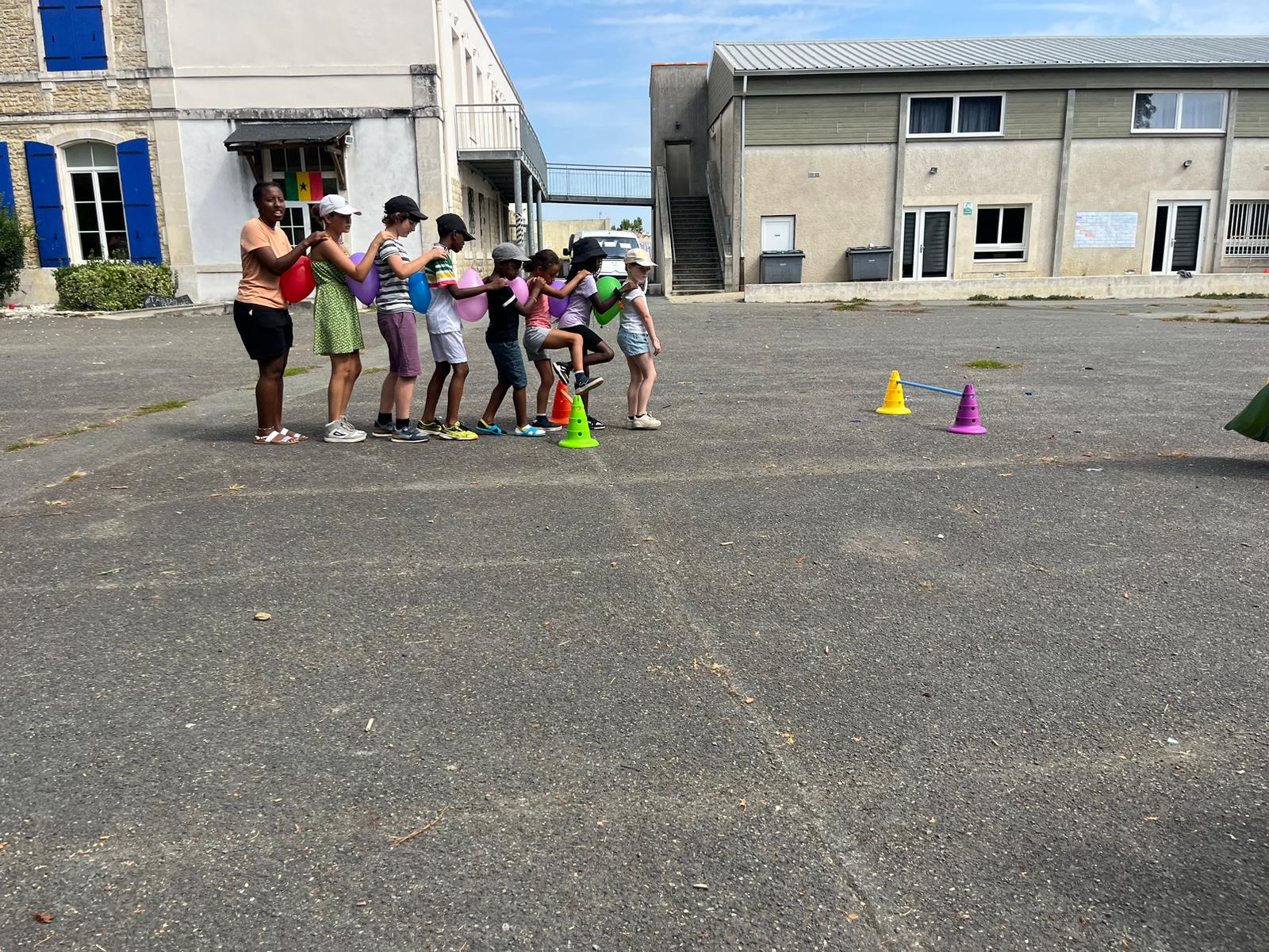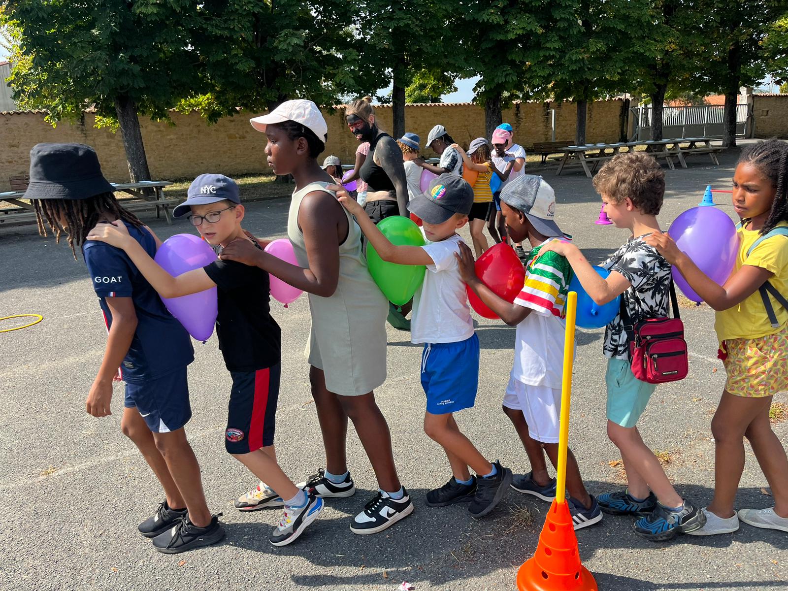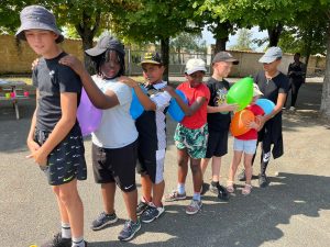 Ce matin, on a pris l’avion pour aller au Sénégal, une fois arrivé, on a fait différents petits jeux. On a fait un parcours avec des ballons les uns entre les autres, on a fait une bataille navale avec des ballons rempli d’eau et aussi un jeu où il fallait trouver les objets que nous demandait le fétiche. Ces épreuves nous permettaient de construire un mur afin de nous protéger d’une tempête de sable.
