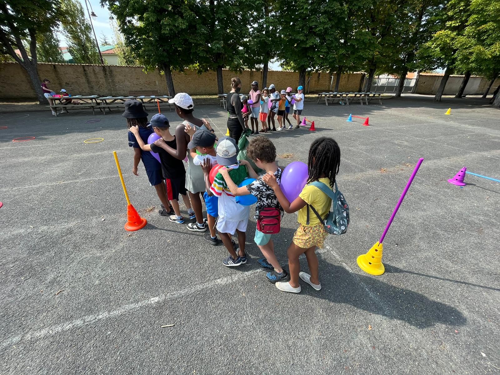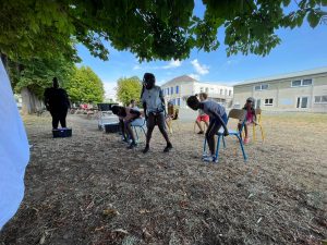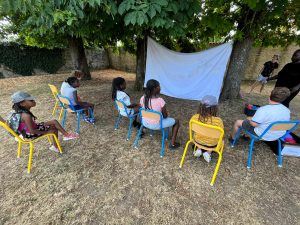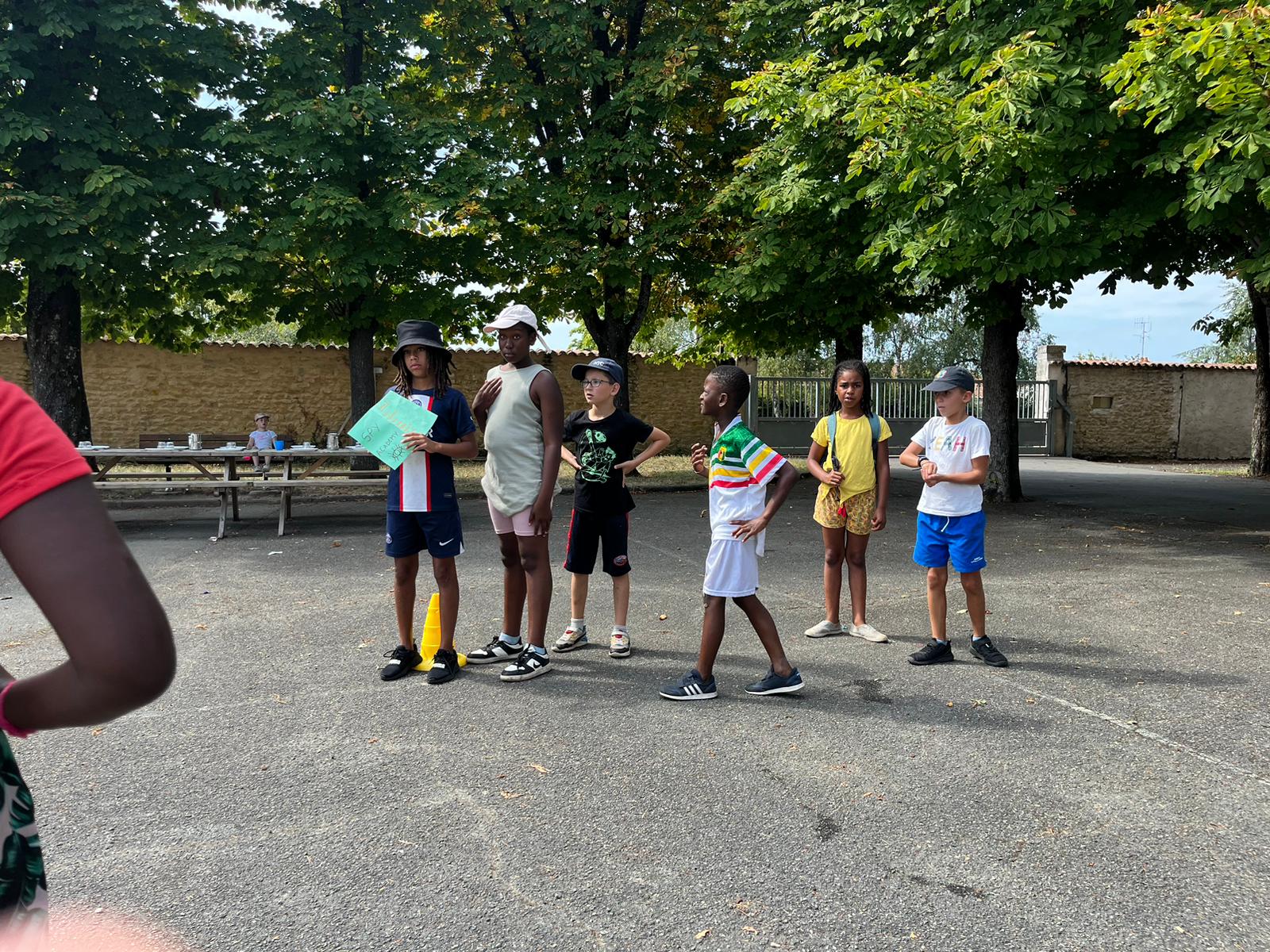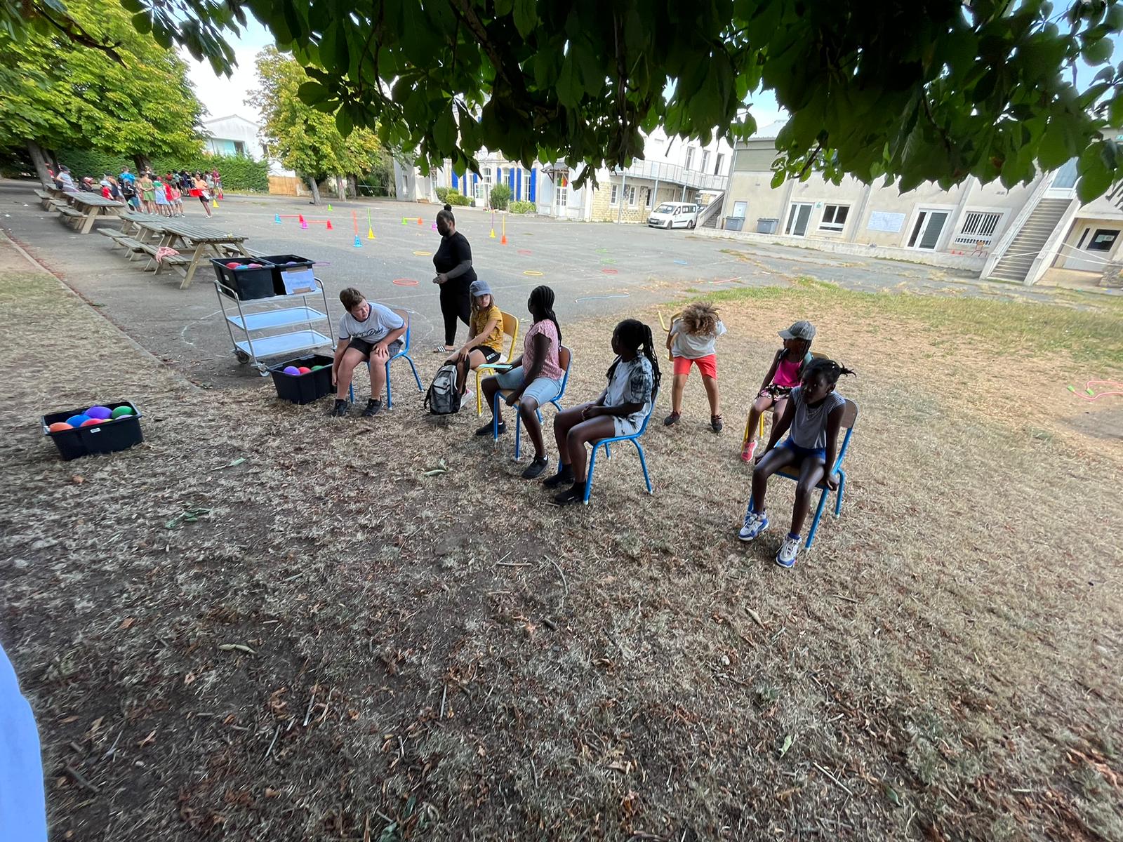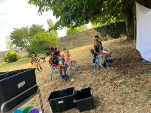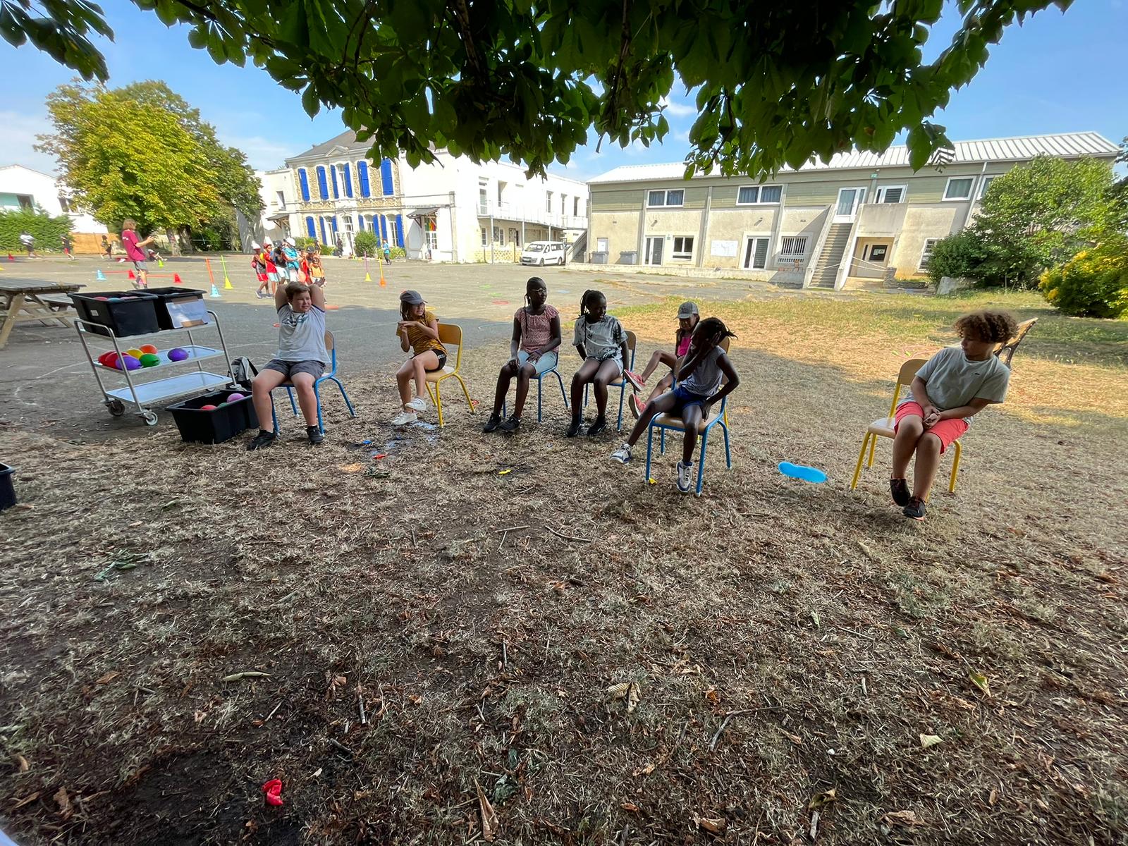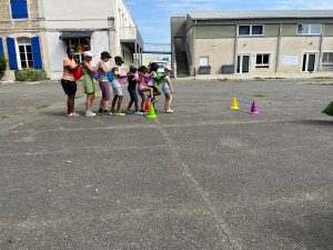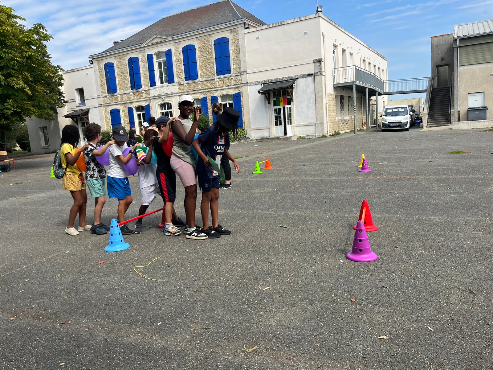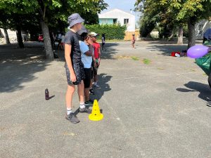 Ce matin, on a pris l’avion pour aller au Sénégal, une fois arrivé, on a fait différents petits jeux. On a fait un parcours avec des ballons les uns entre les autres, on a fait une bataille navale avec des ballons rempli d’eau et aussi un jeu où il fallait trouver les objets que nous demandait le fétiche. Ces épreuves nous permettaient de construire un mur afin de nous protéger d’une tempête de sable.
