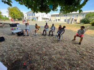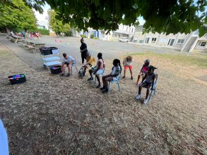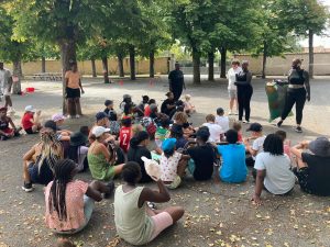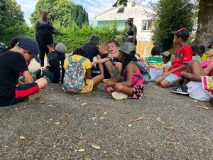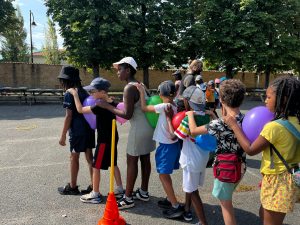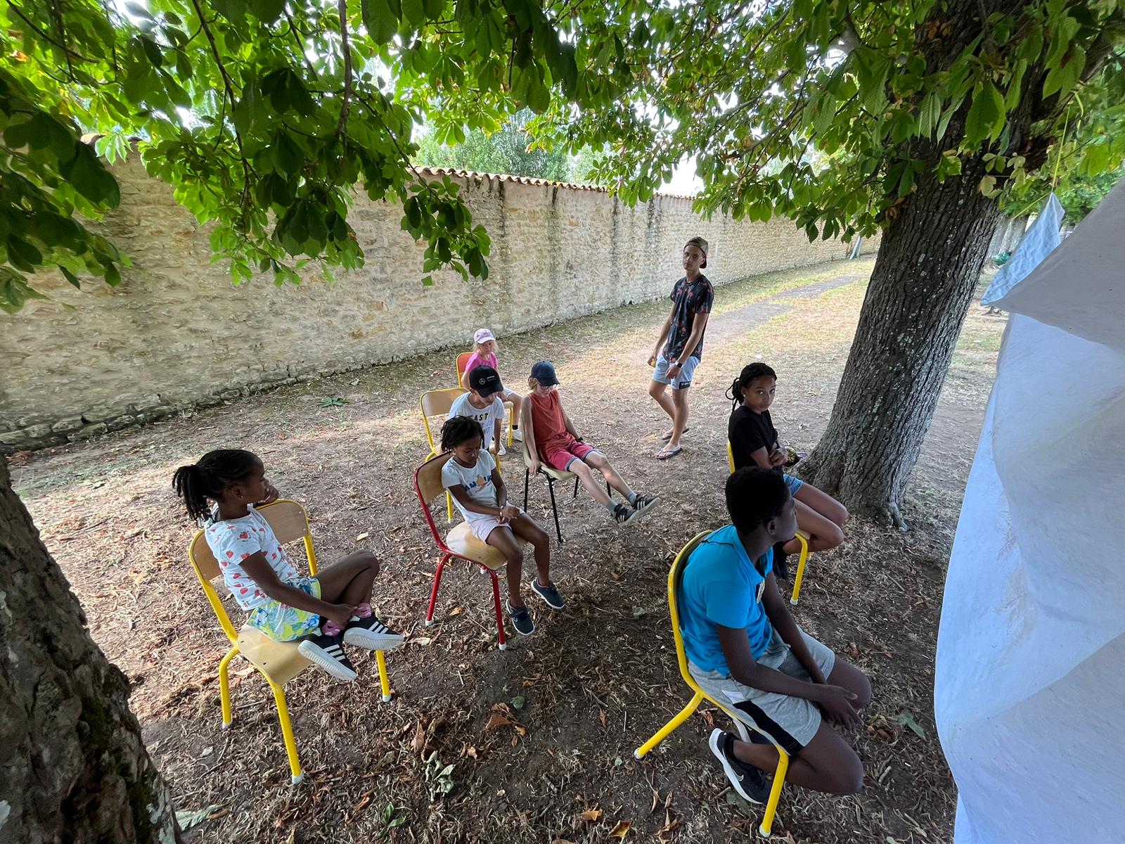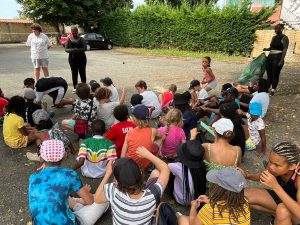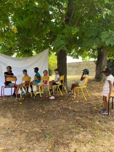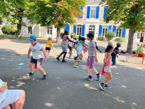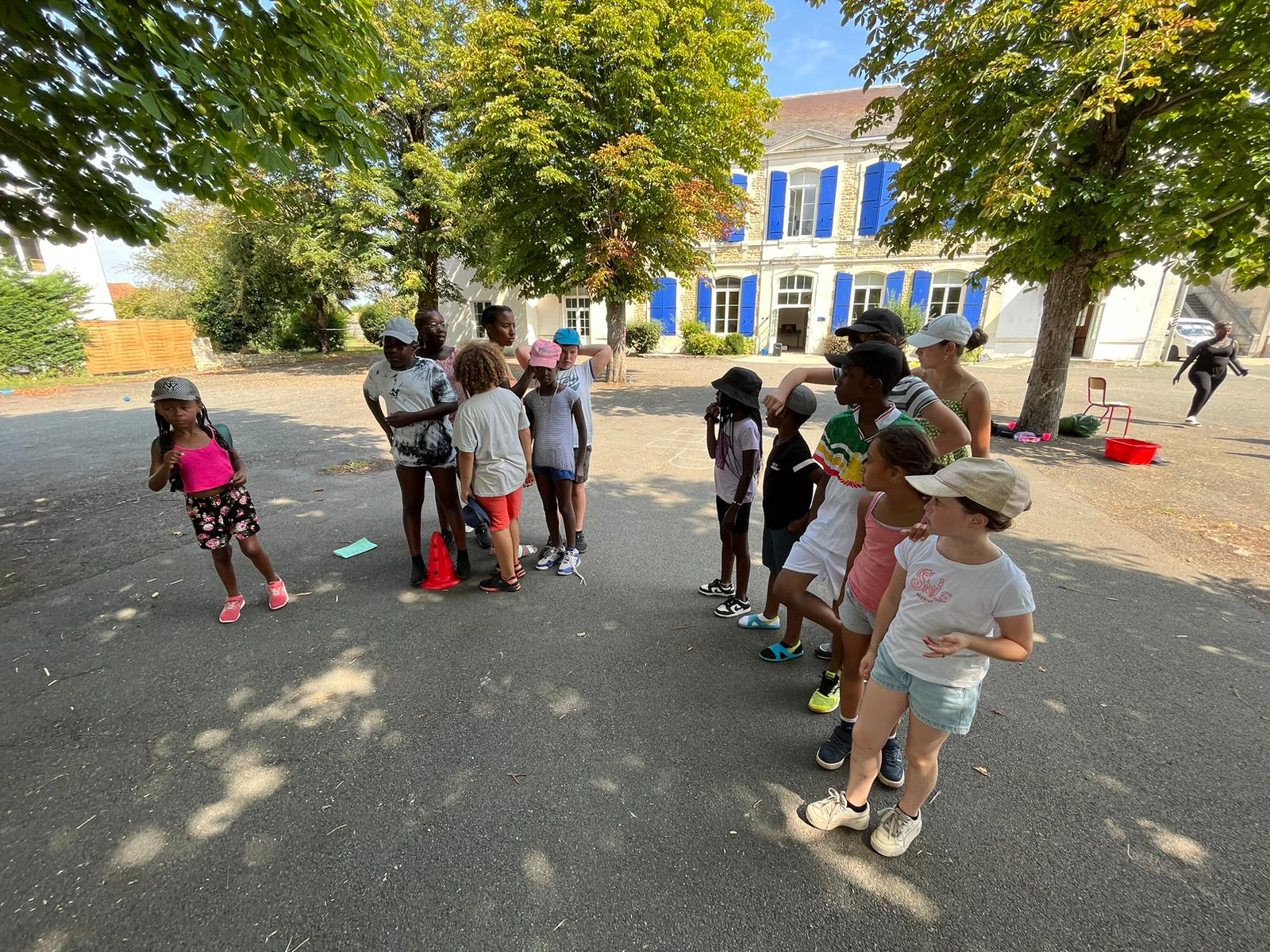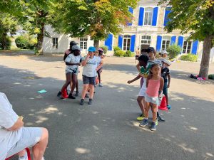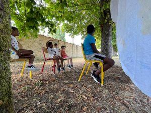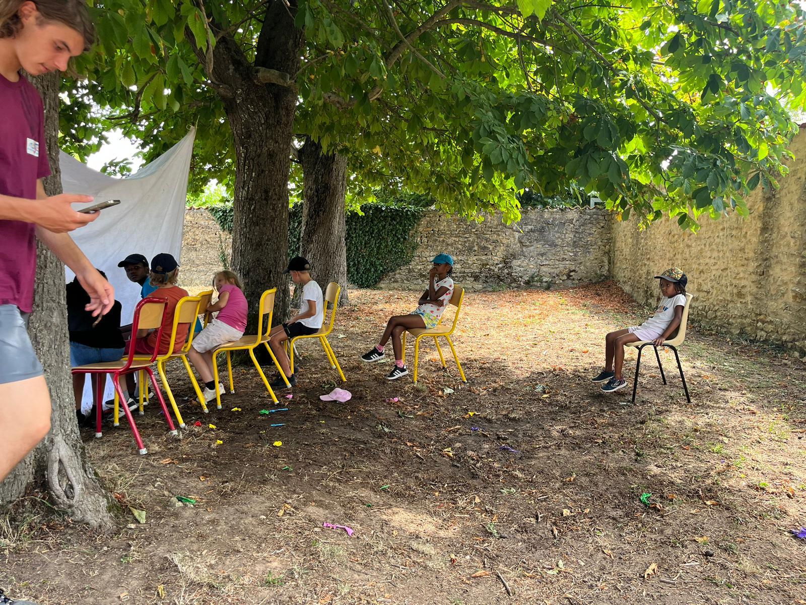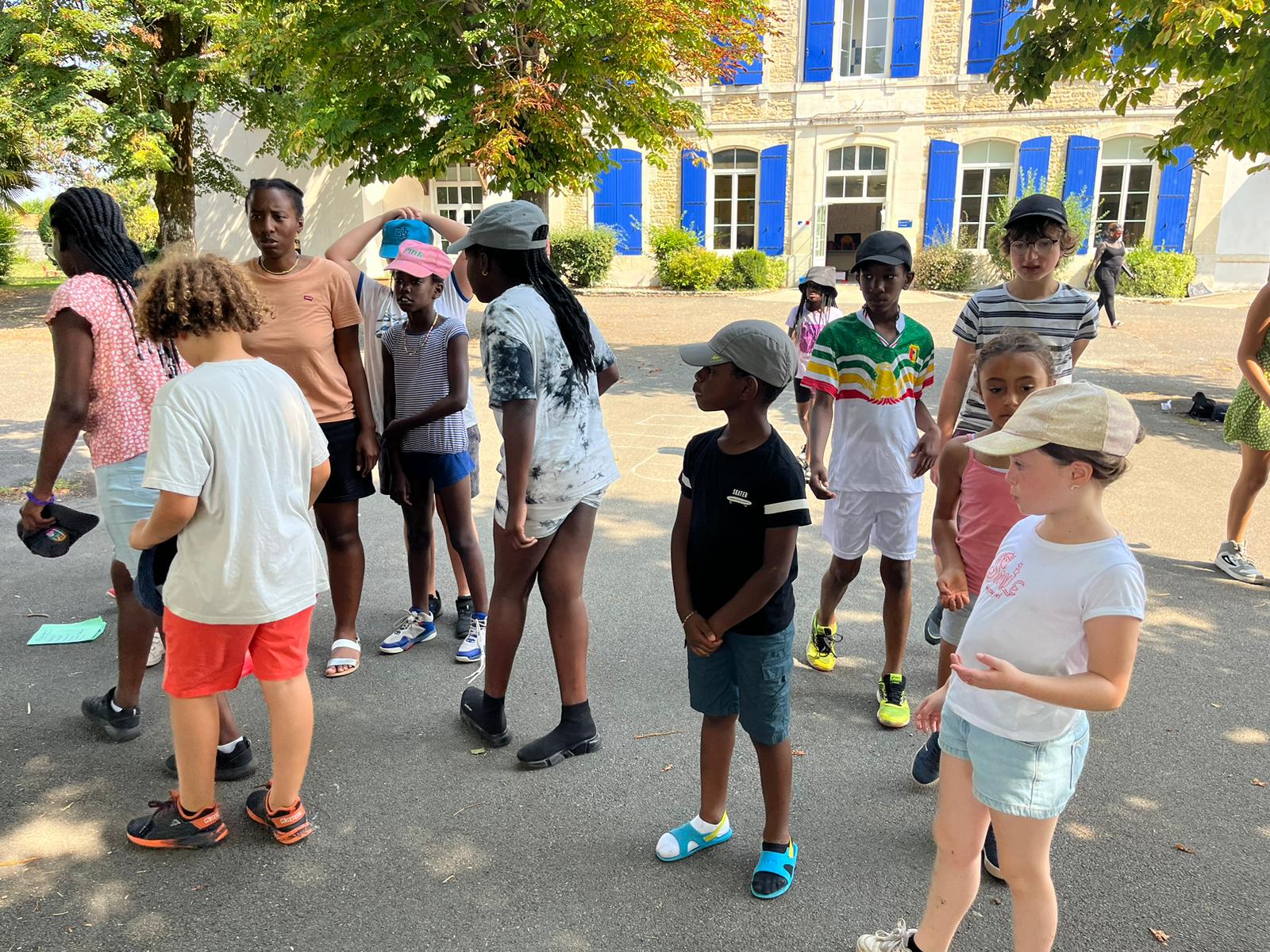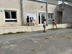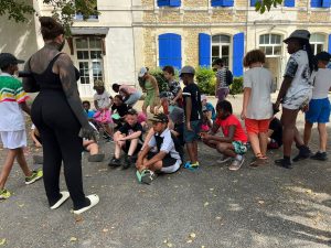 Ce matin, on a pris l’avion pour aller au Sénégal, une fois arrivé, on a fait différents petits jeux. On a fait un parcours avec des ballons les uns entre les autres, on a fait une bataille navale avec des ballons rempli d’eau et aussi un jeu où il fallait trouver les objets que nous demandait le fétiche. Ces épreuves nous permettaient de construire un mur afin de nous protéger d’une tempête de sable.