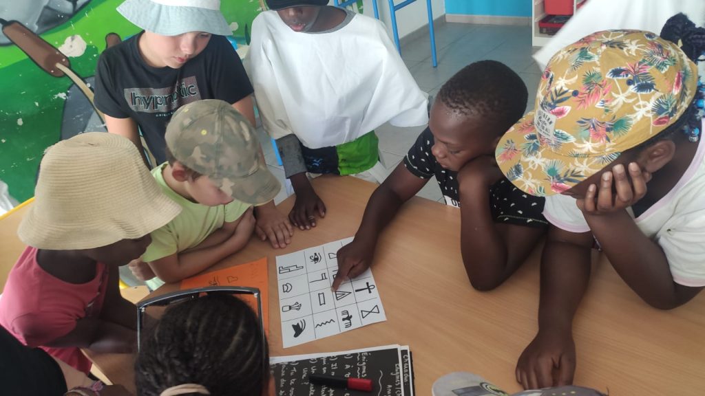 Ainsi, aujourd’hui la déesse Néfertiti est venue proposé des défis aux enfants afin de récupérer la 1ère plume. Ce matin, ils ont réalisé un parcours koh-lanta grandeur nature et cette après-midi ils ont commencé par faire aller leurs cerveaux pour résoudre des énigmes puis ils ont fait un lynx, cobras, scorpion pour se départager et enfin récupérer la plume magique celle de la divinité.